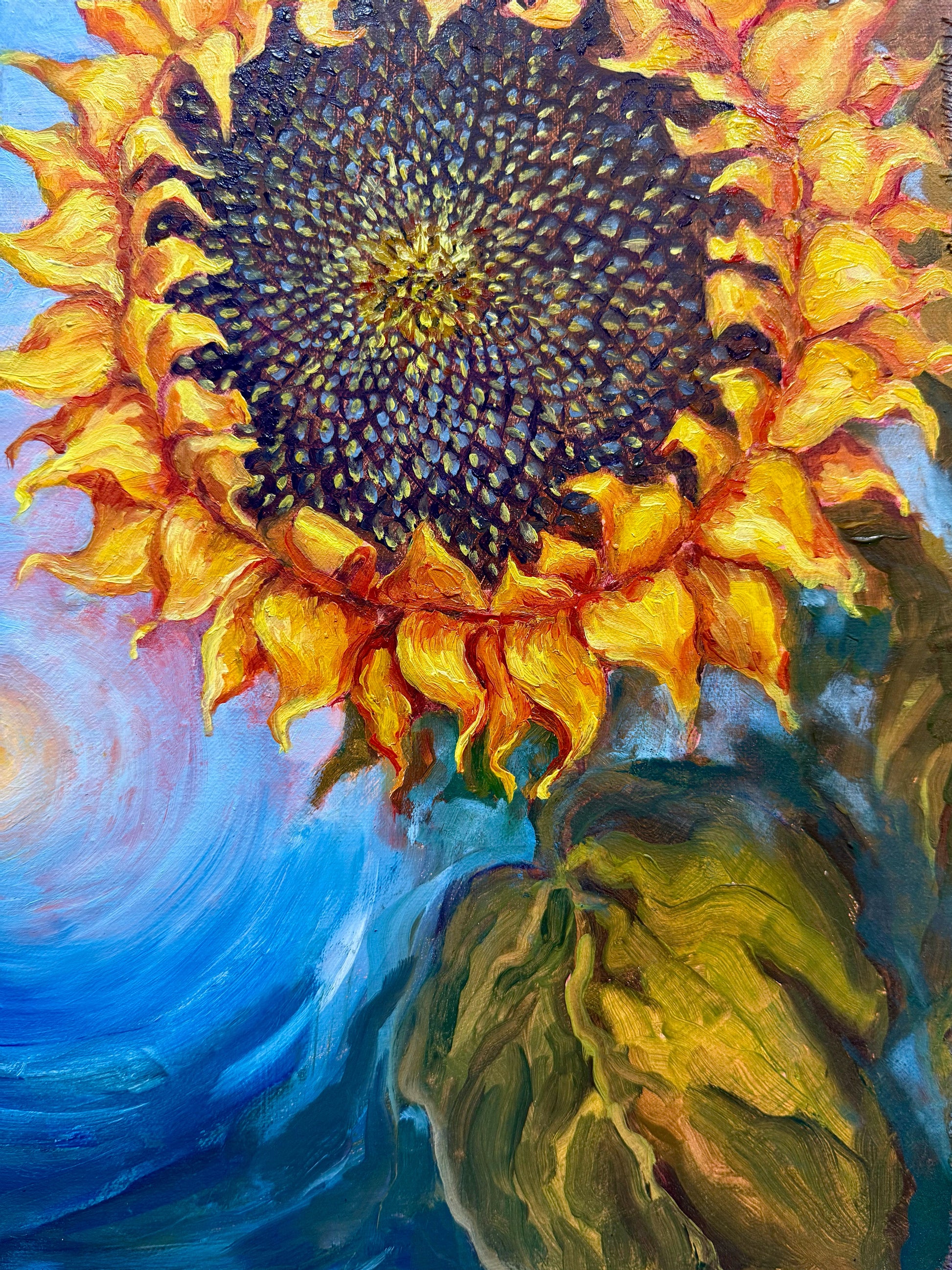 Dans Mémoire du Soleil, l’artiste érige le tournesol en astre terrestre — symbole de la prospérité et de l’unité de l’Ukraine. Chaque graine, patiemment réunie au cœur d’un cercle parfait, incarne la force d’un peuple uni ; la main qui tient un seul grain préserve, comme dans un hiatus sacré, la quintessence d’une mémoire collective — ce petit éclat de lumière que nul oppression ne saurait effacer.