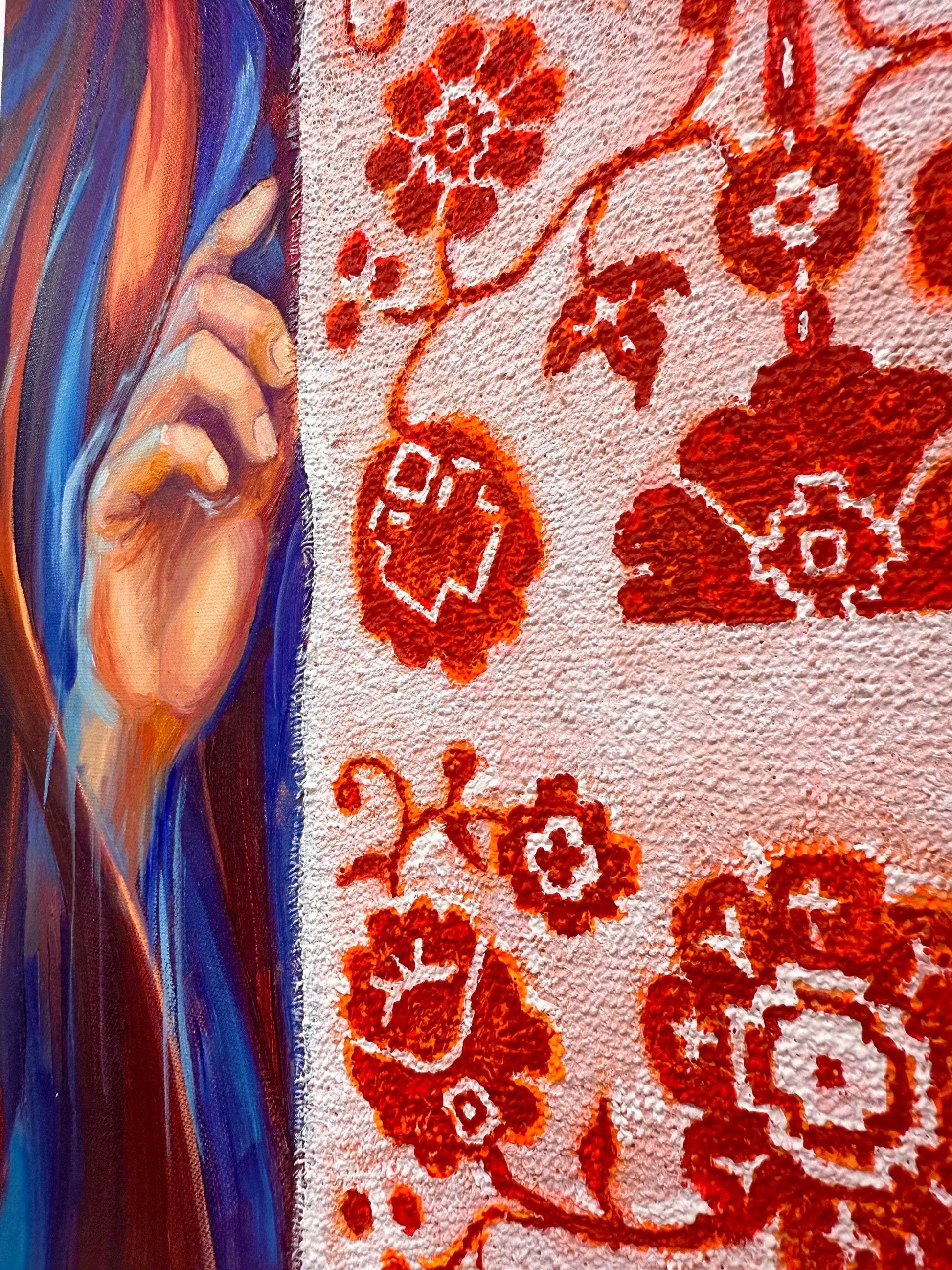 À travers les fils rouges qui tissent le cœur du tableau, l’artiste révèle une vérité universelle : la vie elle-même est une broderie sacrée. Chaque point relie le passé à l’avenir, chaque motif conserve la mémoire d’un amour, d’un foyer, d’une espérance. Dans la douceur du geste et la lumière du symbole, Les Fils de la Vie célèbrent ce lien invisible qui unit les générations — ce fil éternel tendu entre les mains de ceux qui aiment, protègent et transmettent.