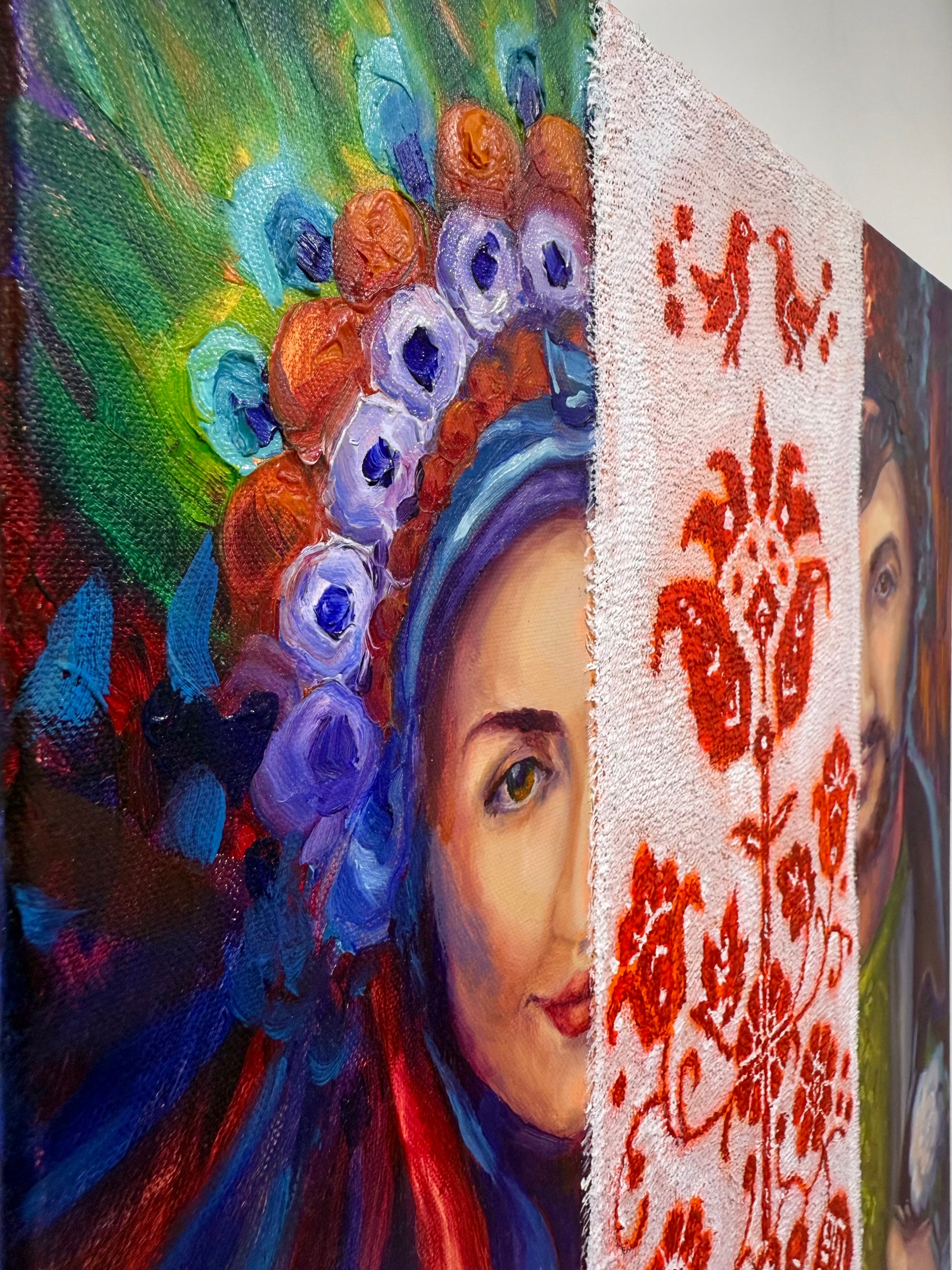 De part et d’autre du tissu se tiennent les époux. La jeune femme porte un venok — couronne de fleurs, de rubans et de plumes — symbole de pureté, de beauté et de lien avec les forces naturelles. Ce diadème de jeunesse, éclatant et fragile, sera remplacé après le mariage par un voile ou un foulard, signe de maturité et de responsabilité. À ses côtés, l’homme revêt une chemise brodée par sa fiancée — offrande d’amour et de protection. Ensemble, ils incarnent le passage du souvenir ancestral à la création d’un nouveau commencement.