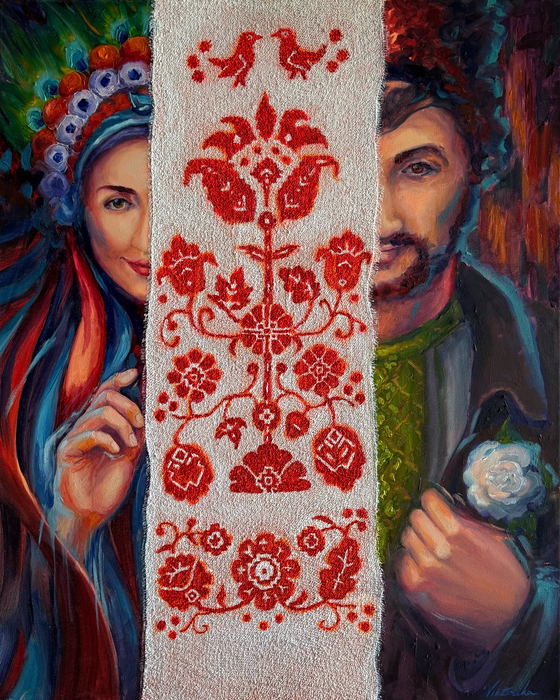 Dans Les Fils de la Vie, l’artiste célèbre le mariage comme un acte sacré où deux destins s’unissent pour prolonger la mémoire du monde. Au centre de la composition s’étend un tissu rituel nuptial, brodé de fils rouges — couleur de l’amour, de la vitalité et, dans la tradition ukrainienne, couleur protectrice par excellence. Long de plusieurs mètres, il relie symboliquement les pas de la mariée et du marié : chacun se tient sur sa moitié, inscrivant ainsi dans la matière du tissu le serment d’une vie partagée.